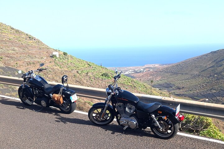 We start with the Harleys in las Breñas and from there through the vineyards of La Geria via Tinajo to La Santa and on to Famara. Until then you have run in on your Harley and after a small coffee stop you continue into the winding north towards Teguise, Los Valles, Tabayesco, Haria up to the Mirador del Rio with a view of La Graciosa. During the entire tour, our focus is on riding the most beautiful motorcycle routes and on the full enjoyment of the Harley-Davidson. Our tour is not aimed at visiting sights. On this tour, every biker should get his money's worth. At the end of the tour we enjoy the view of the sea in el Golfo and look forward to "petrol talks" among bikers.