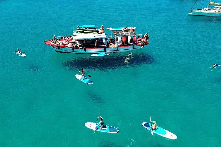 Embark on a 3-hour boat excursion from San Antonio (Ibiza) to some of the most beautiful beaches. Once there, you’ll have 2 hours to enjoy stand-up paddleboarding (SUP) and snorkeling, with all necessary equipment provided, including life jackets and safety gear. Relax with complimentary cold drinks while enjoying the ambient music. The boat features beds for lounging, shaded areas, a bathroom, and a freshwater shower for your comfort.